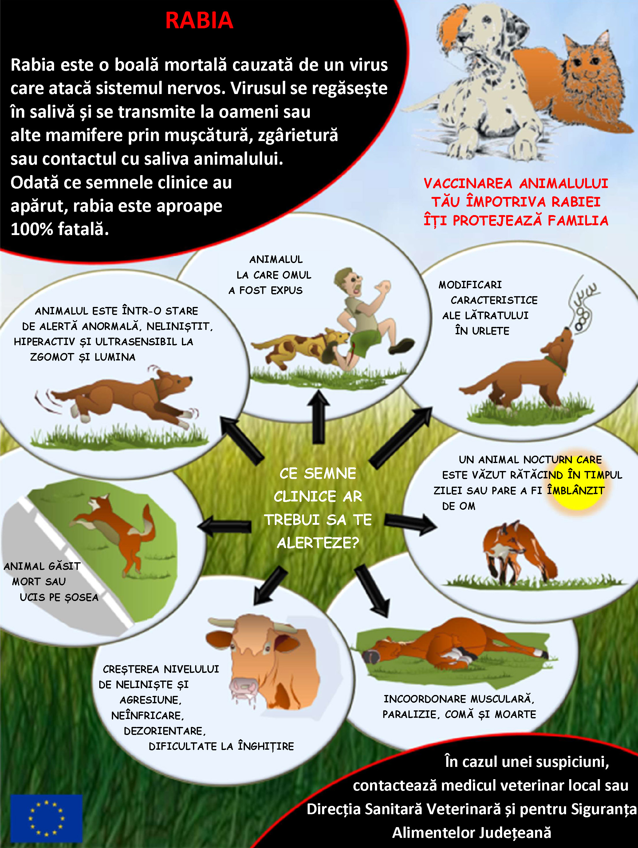 DSVSA Satu Mare face apel la sătmăreni ca la orice semne clinice sau modificări de comportament observate la animalele domestice, câini, pisici, bovine, ovine, caprine cu probabilitate de contact cu carnasiere sălbatice, sau în cazul existenței animalelor care au muscat sau zgâriat, să anunțe obligatoriu medicul veterinar pentru a examina animalele și a le pune sub observație sau restricție.