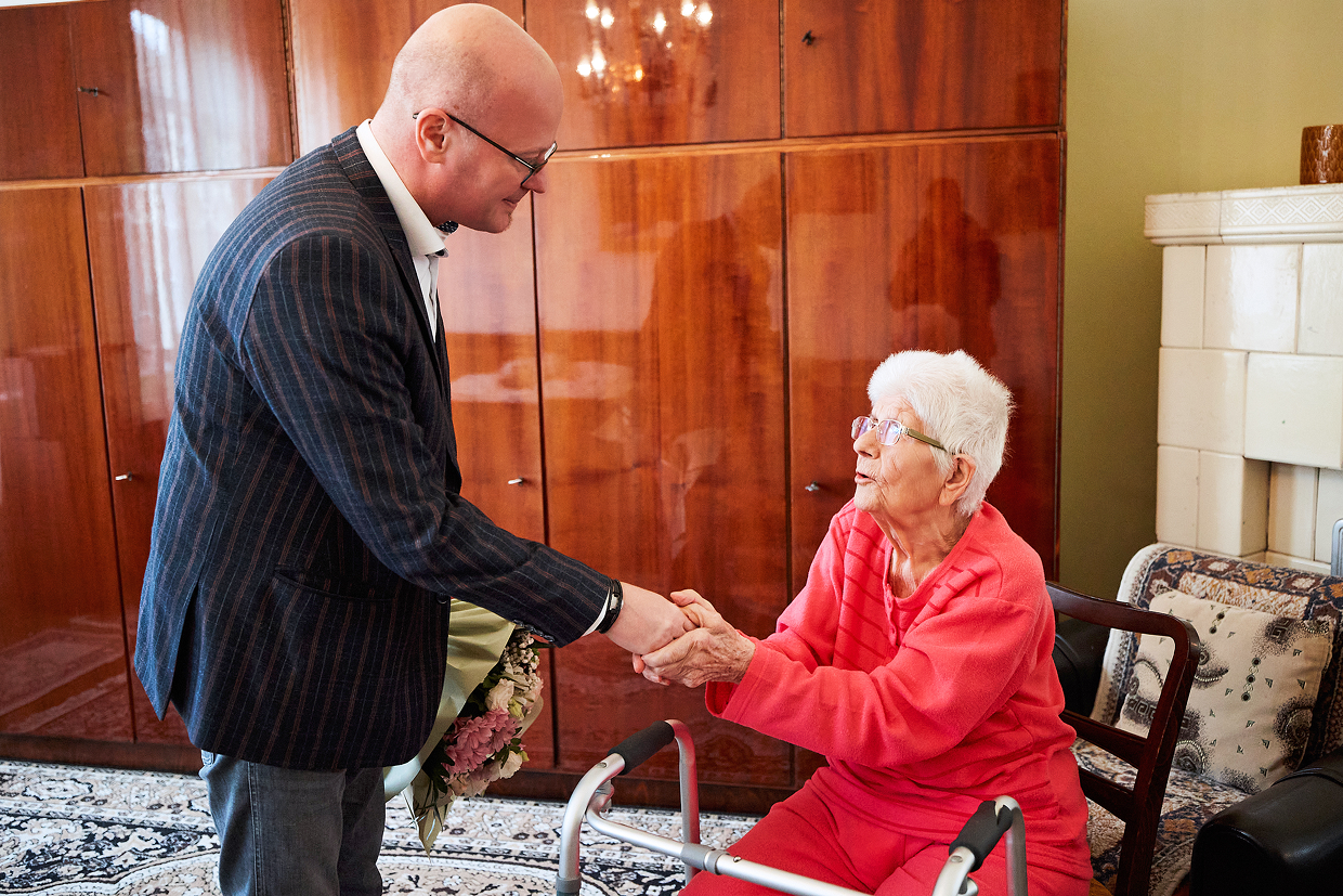 ,,La mulți ani, stimată doamnă Puscaș Rozalia! Satu Mare se mândrește cu o valoroasă comunitate de seniori. Sunt onorat să vă fiu azi alături, cu prilejul împlinirii onorabilei vârste de 100 de ani. Experiența și înțelepciunea dumneavoastră și a întregii comunități de seniori din Satu Mare ne îmbogățește viața. Să aveți parte de multă sănătate și zile senine!”, au fost cuvintele primarului municipiului Satu Mare, Kereskényi Gábor, cu prilejul vizitei surpriză făcută acasă la doamna Puscaș Rozalia de ziua sa.