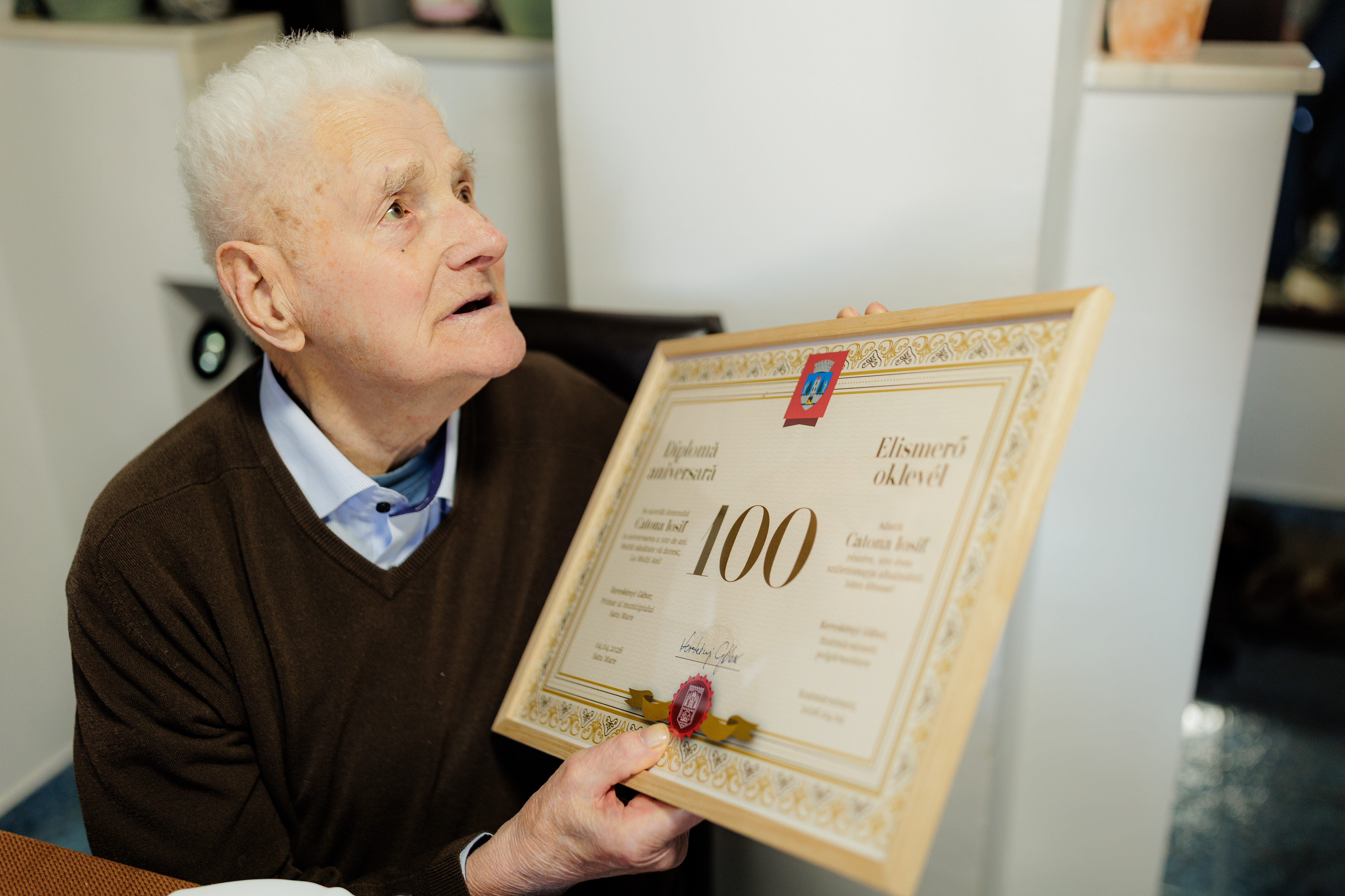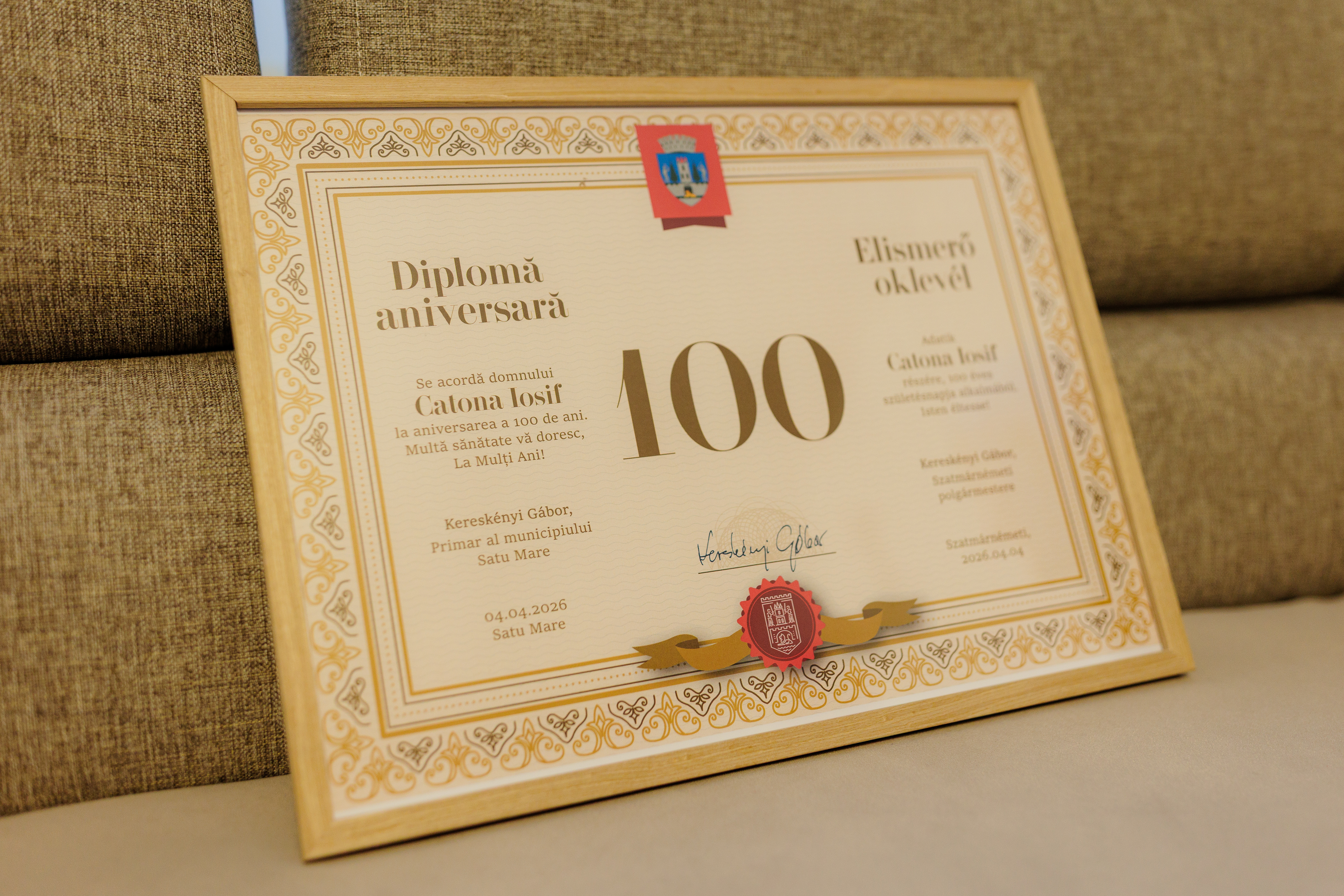 ,,La mulți ani, stimate domn Catona Iosif! Sunt onorat să fiu azi alături de dumneavoastră pentru a vă felicita și a vă mulțumi totodată pentru contribuția adusă la ceea ce este Satu Mare azi. Cei 100 de ani pe care-i împliniți sunt pentru noi mai mult decât o vârstă, sunt lecții și valori ce ne inspiră. Să aveți parte de multă sănătate și momente frumoase alături de cei dragi!’’, i-a transmis primarul municipiului Satu Mare, Kereskényi Gábor, cu prilejul vizitei surpriză acasă la domnul Catona Iosif de ziua sa.