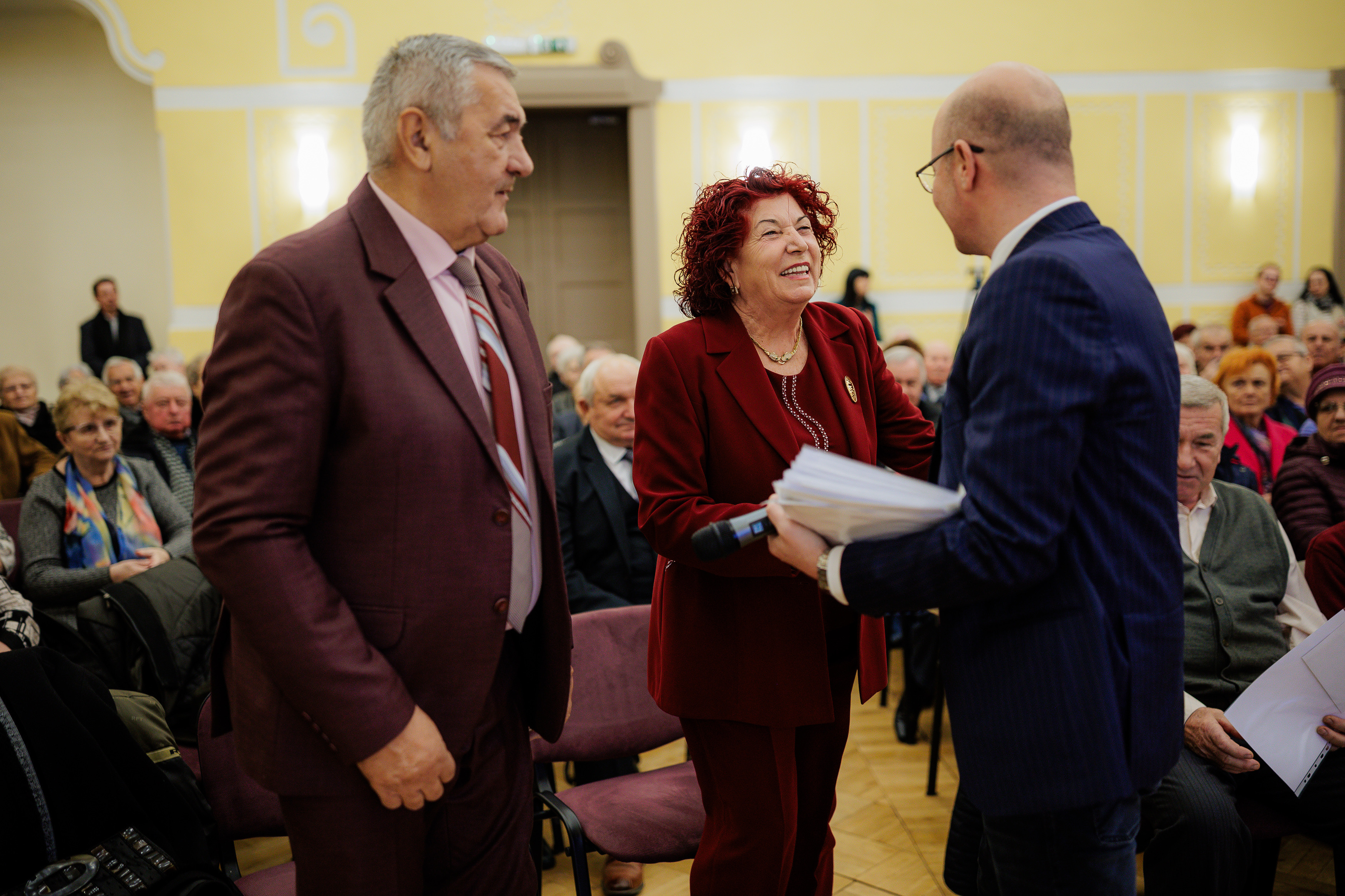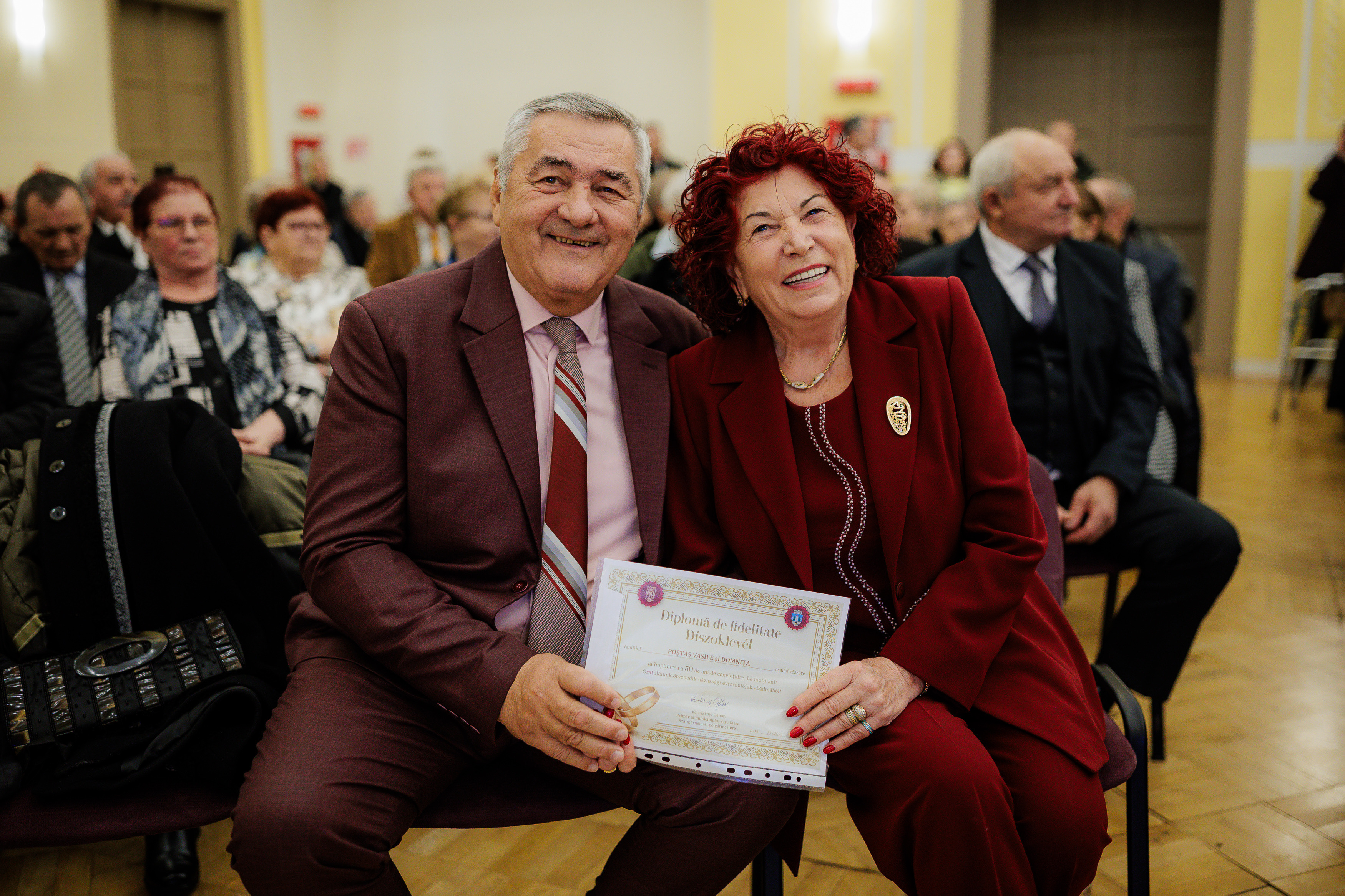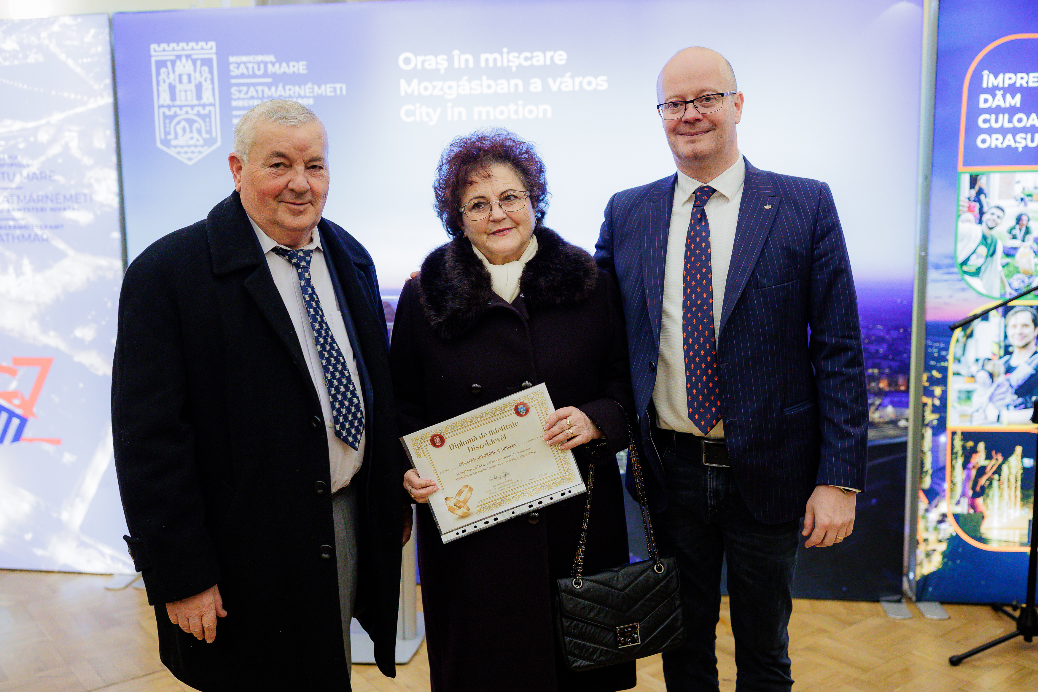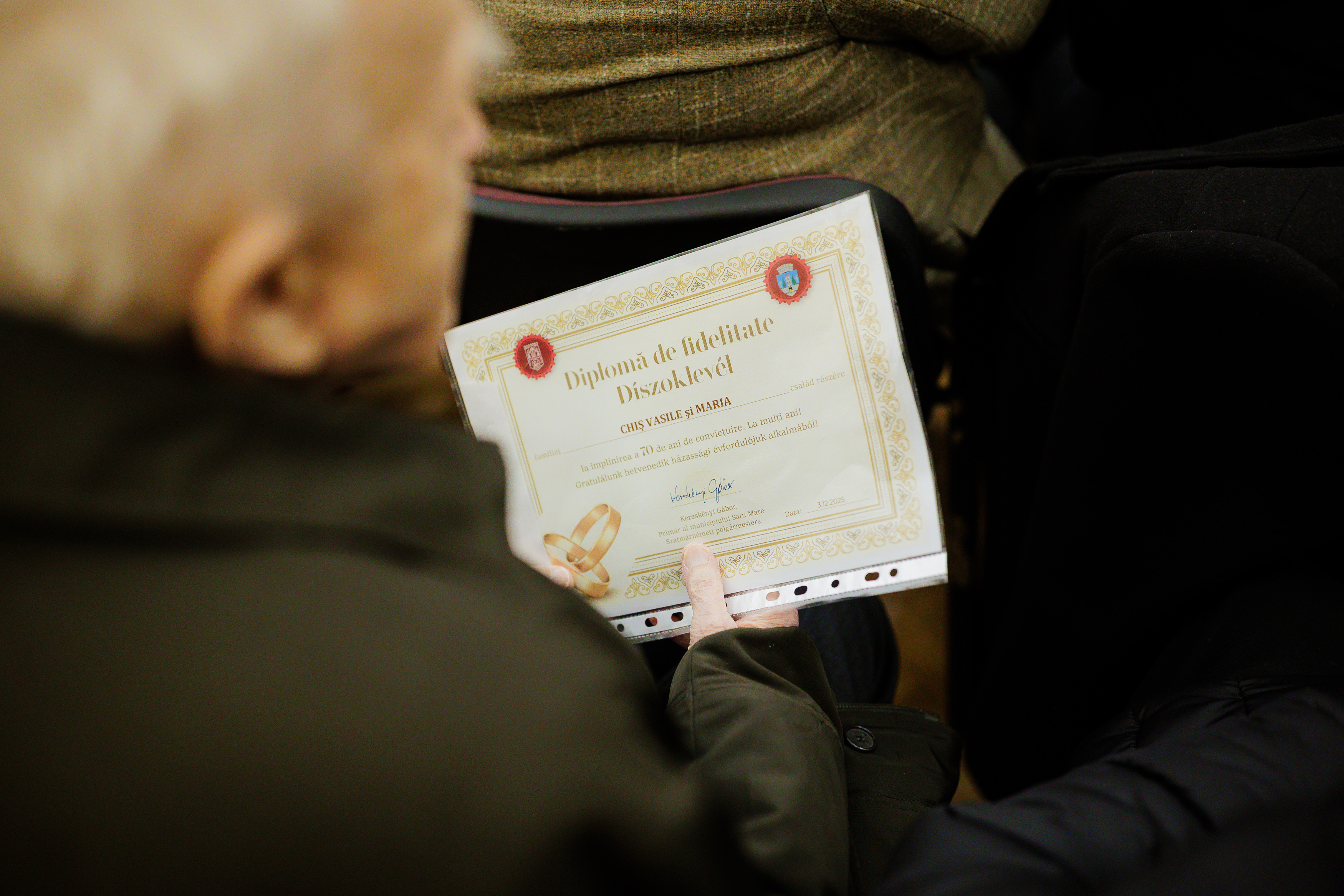 A Szatmárnémeti Polgármesteri Hivatal vezetése ünnepélyes keretek között jubileumi okleveleket és 1000 lejes díjat adott át annak a 114 házaspárnak, akik 70., 60., illetve 50. házassági évfordulójukat ünneplik.
