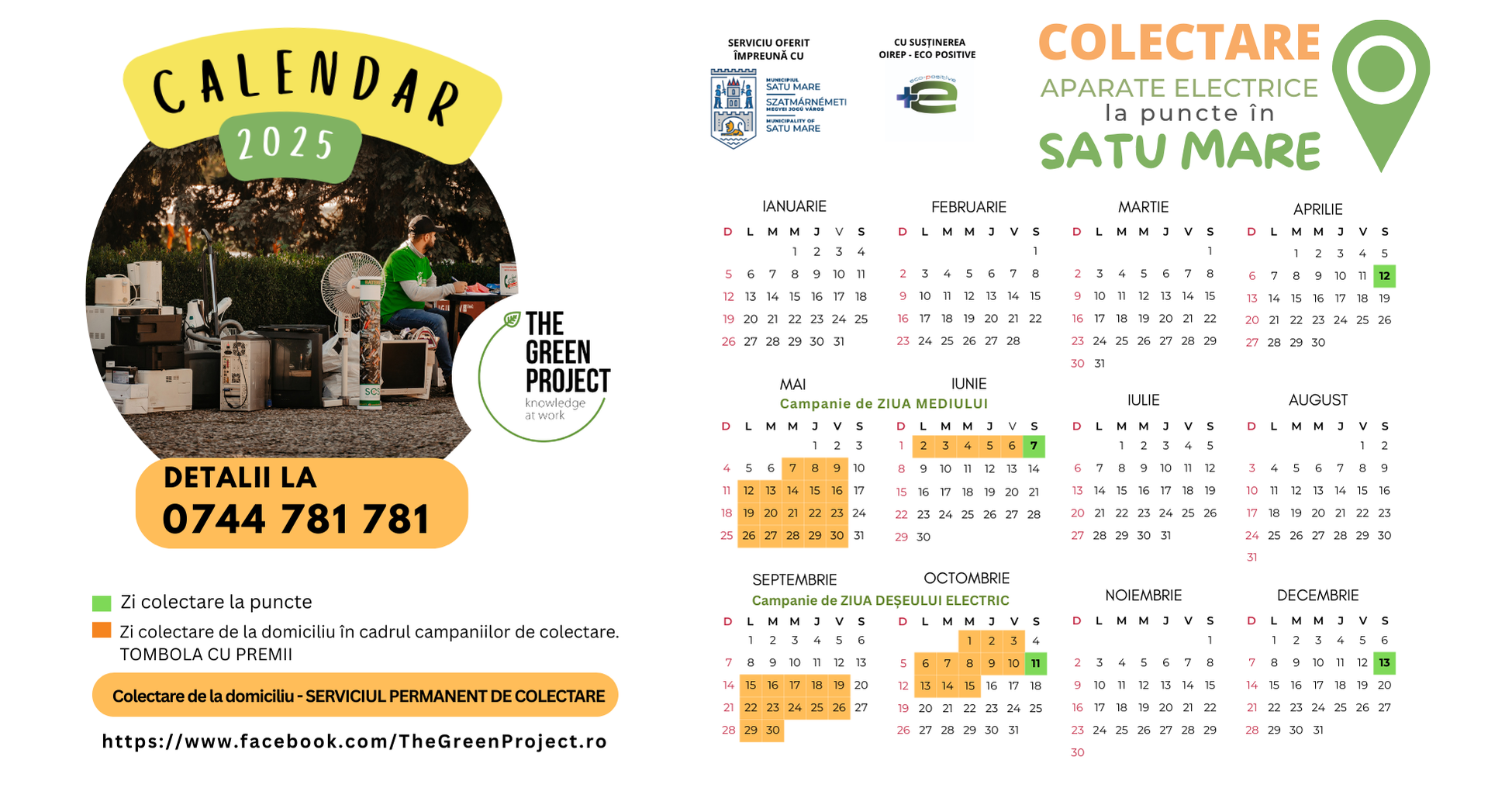 Április 12-én, szombaton 9 és 15 óra között Szatmárnémetiben, a város több pontján felállított gyűjtőpontokon adhatják le a szatmáriak a használaton kívüli elektromos és elektronikai készülékeket. Segítsen hozzájárulni a tisztább környezethez az újrahasznosítással!