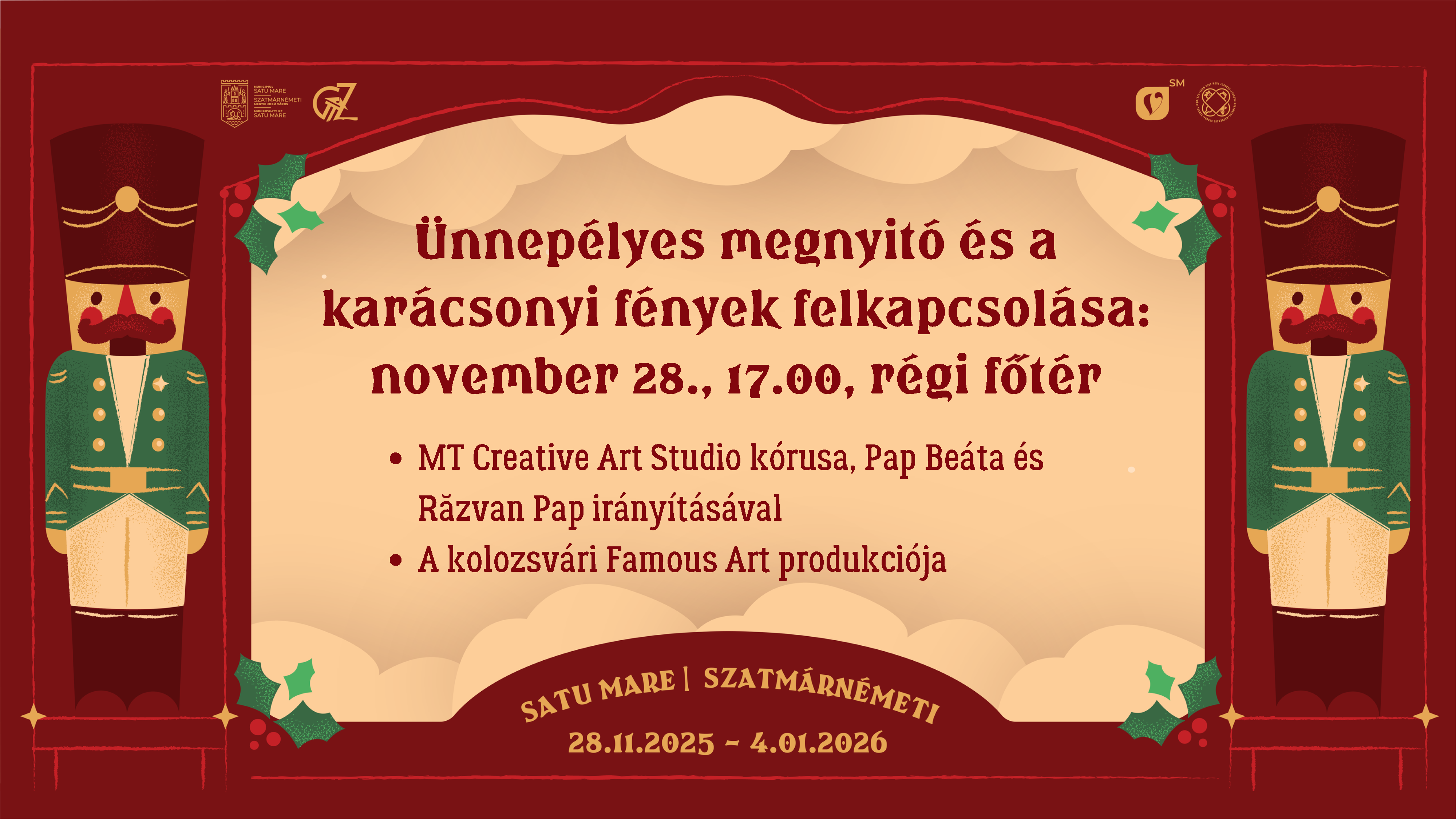 A Szatmárnémeti Karácsonyi Vásár mesés környezetben teremti meg az ünnep varázsát és hagyományait. A város szívében felállított karácsonyfa mellett a látogatók átélhetik a karácsony valódi hangulatát. A megnyitó keretében az MT Creative Art Studio kórusa ad elő karácsonyi énekeket, Pap Beáta és Pap Răzvan vezetésével. A vásár nyitórendezvényén jelenlévőket egy kellemes meglepetés is várja, a tömegben feltűnik majd a karácsonyi időszak egyik legvarázslatosabb és legkedveltebb figurája, a Diótörőből jól ismert katona és Csingiling, a téltündér, akik gólyalábakon járnak majd keringőt. A show a kolozsvári Famous Art produkciója.