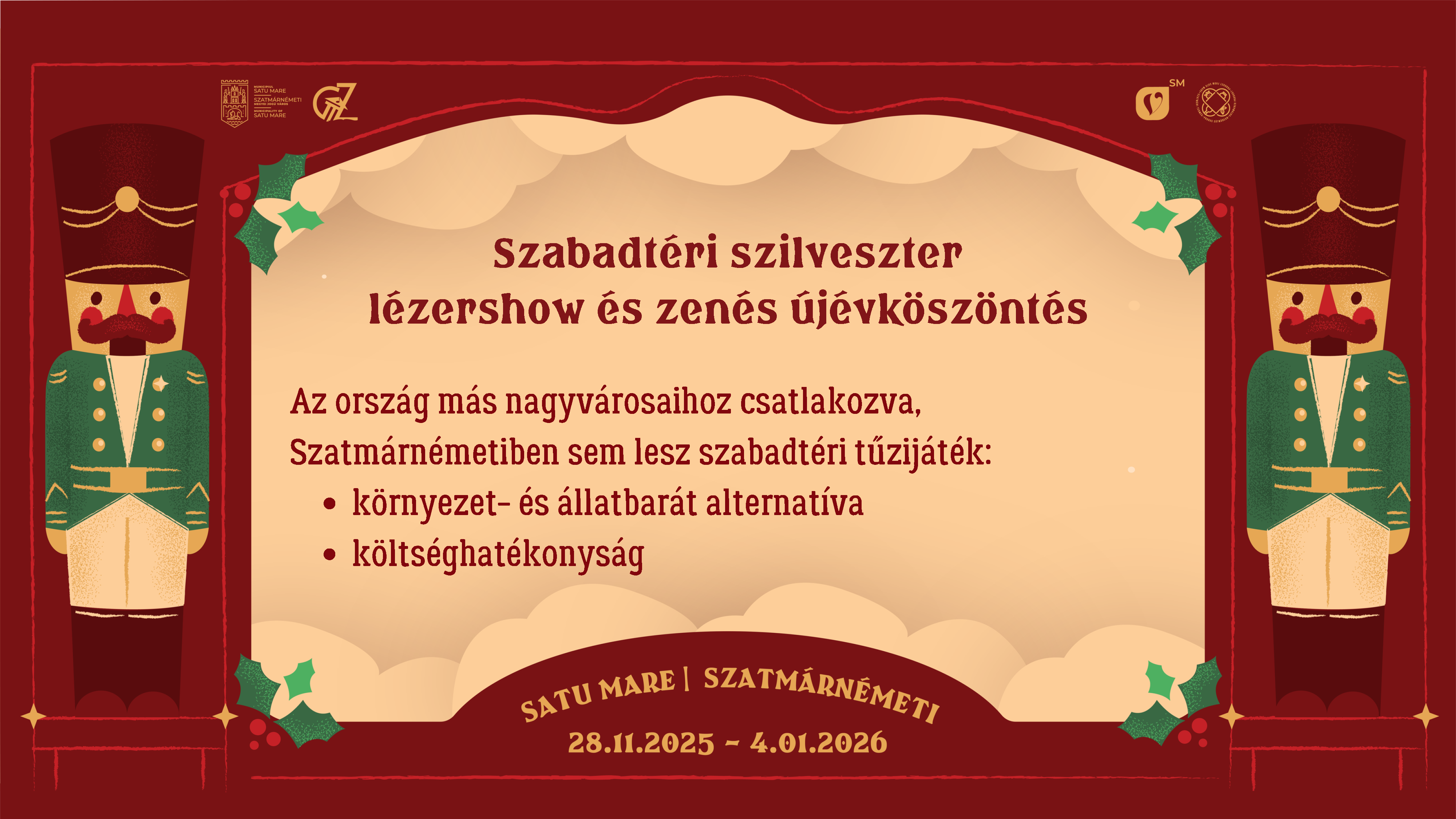 Töltsük együtt a szilvesztert az Október 25. téren! Fergeteges szabadtéri szilveszteri buli várja a szatmáriakat, ahol a zenét helyi DJ-k biztosítják, idén a tűzijáték helyett lézershow-val köszöntjük az új évet. Idén Románia nagyvárosaihoz igazodva lemondunk a tűzijátékról, és látványos lézershow-t készítünk elő.