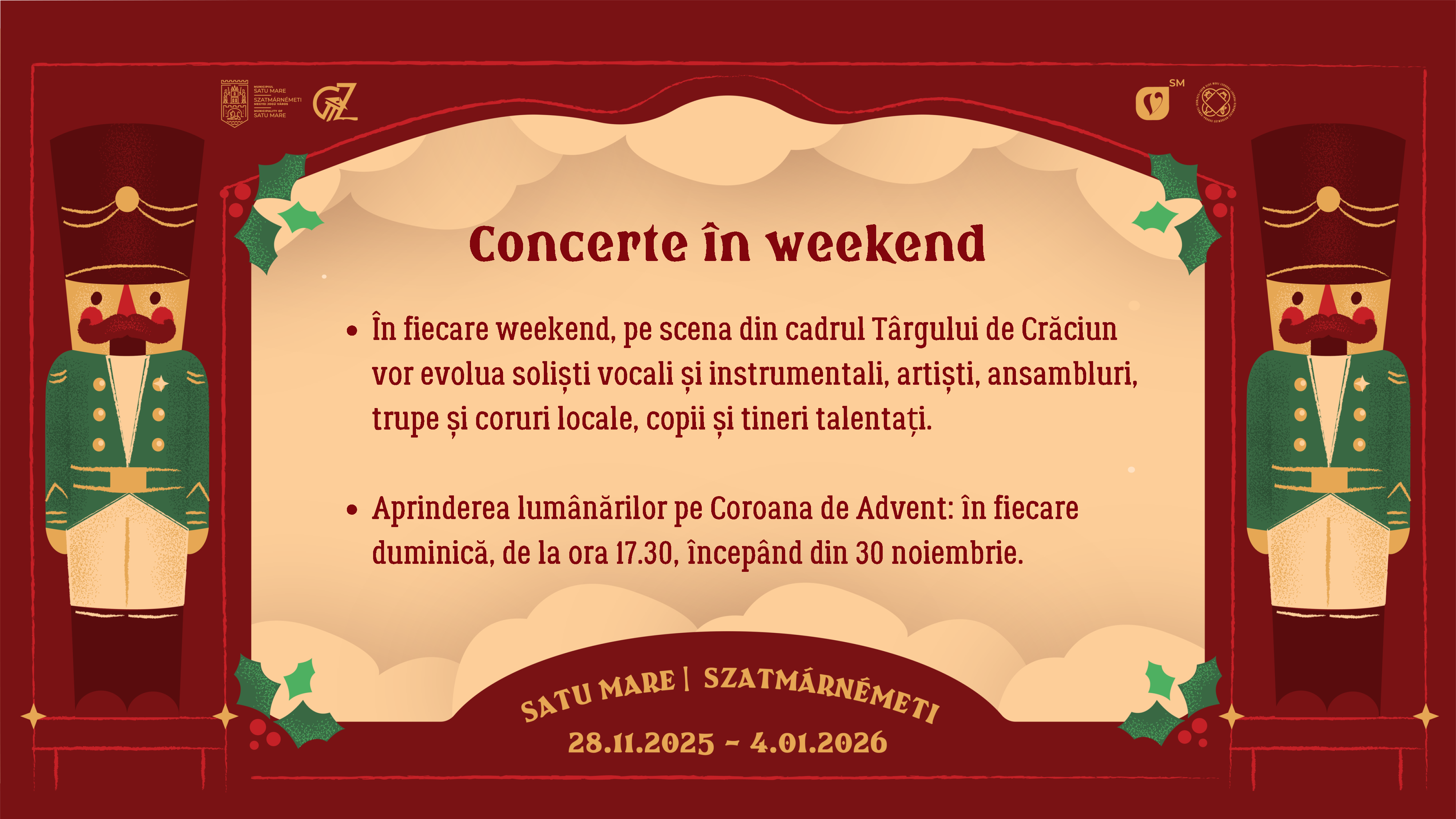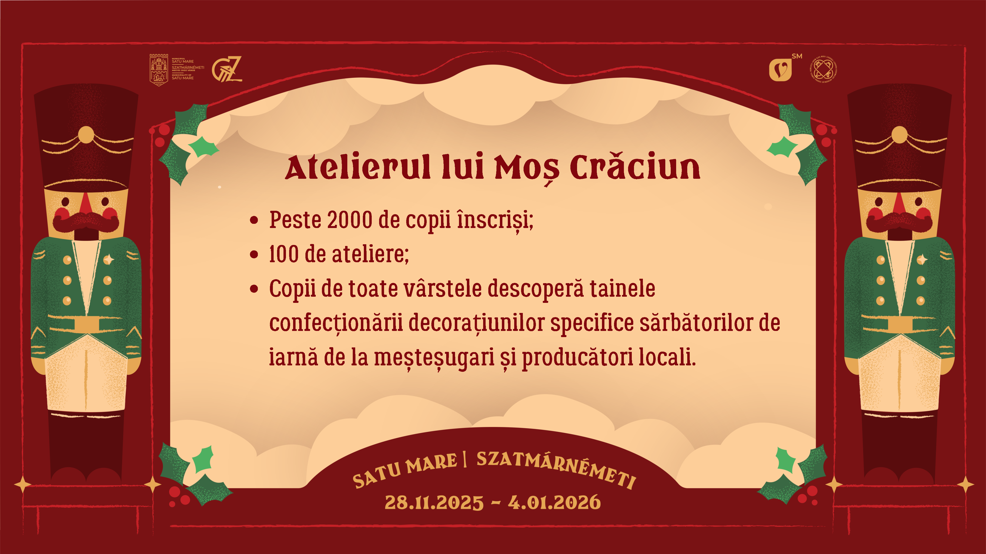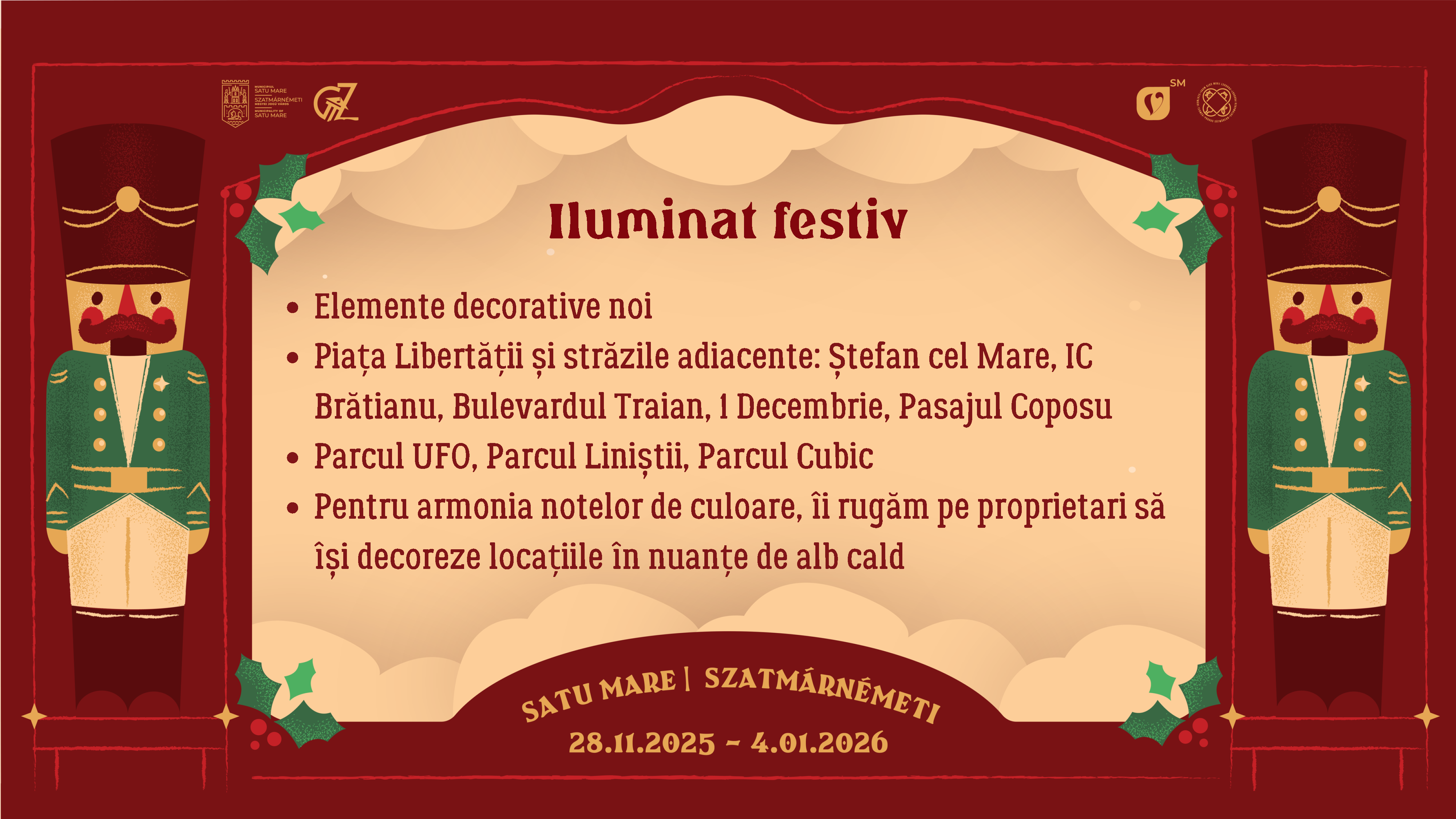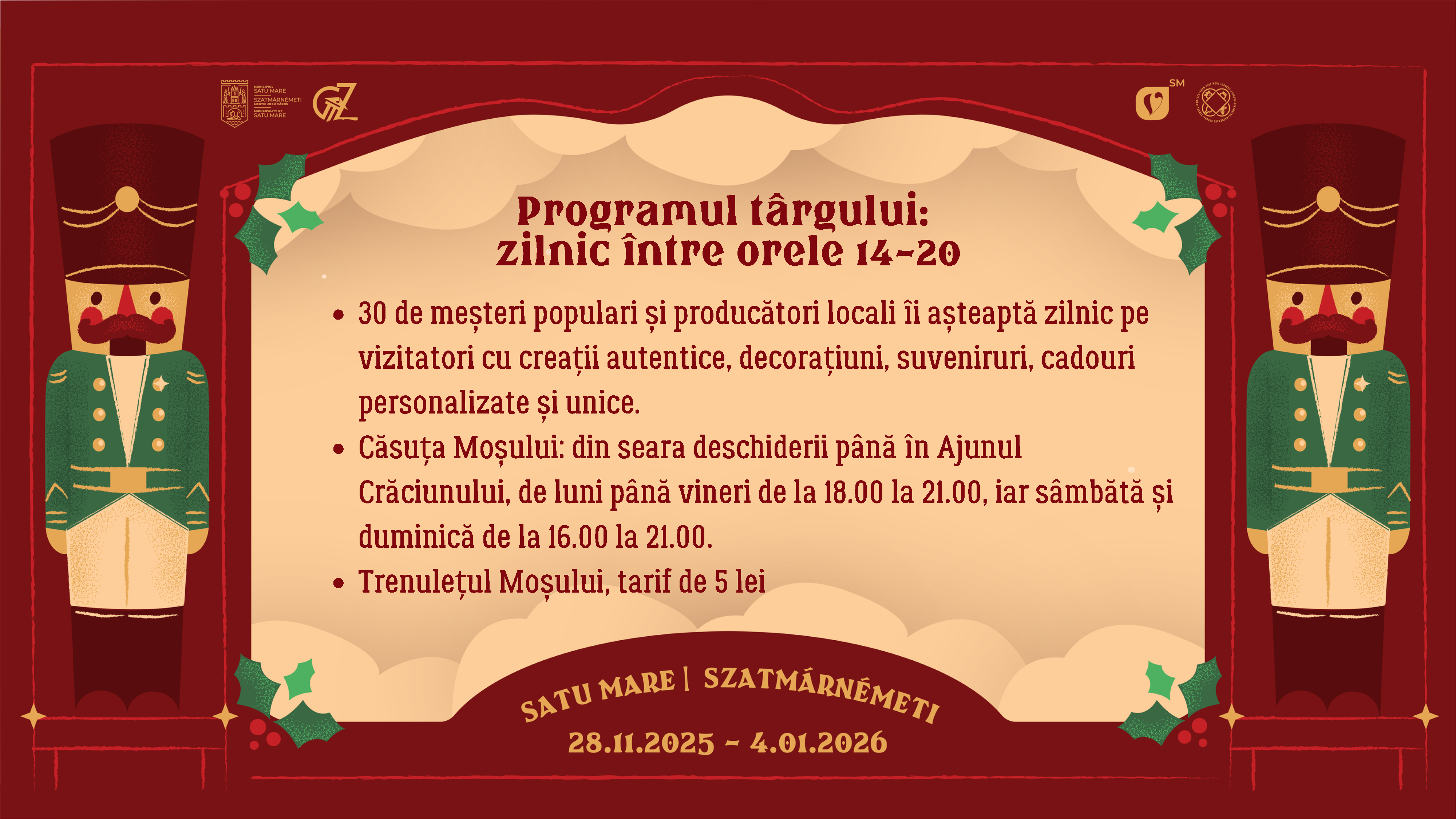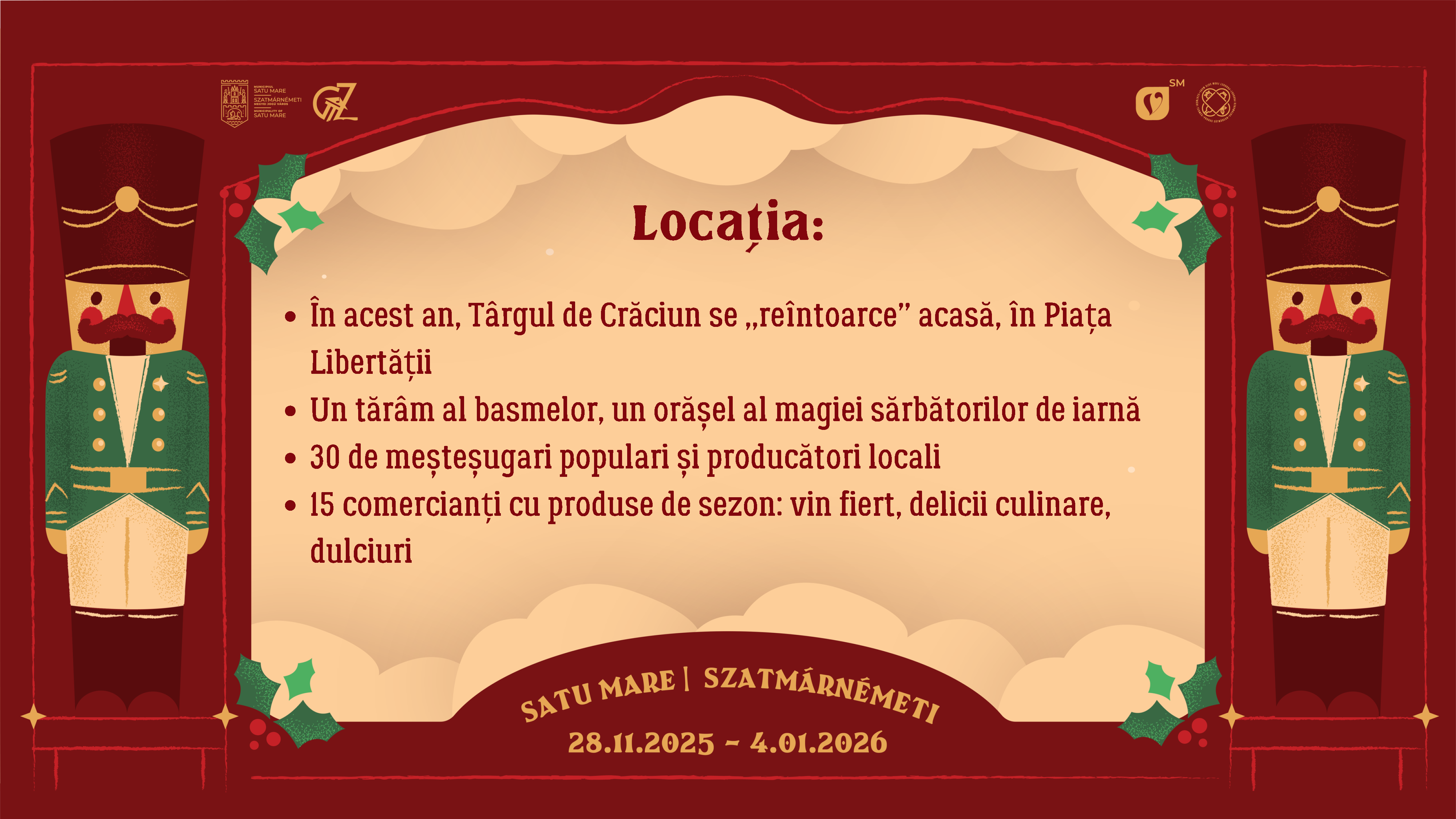 Vă așteptăm așadar cu drag la Târgul de Crăciun din Satu Mare sub cupola luminoasă din Piața Libertății, între 28 noiembrie 2025 și 4 ianuarie 2026, pentru a celebra împreună bucuria Crăciunului.