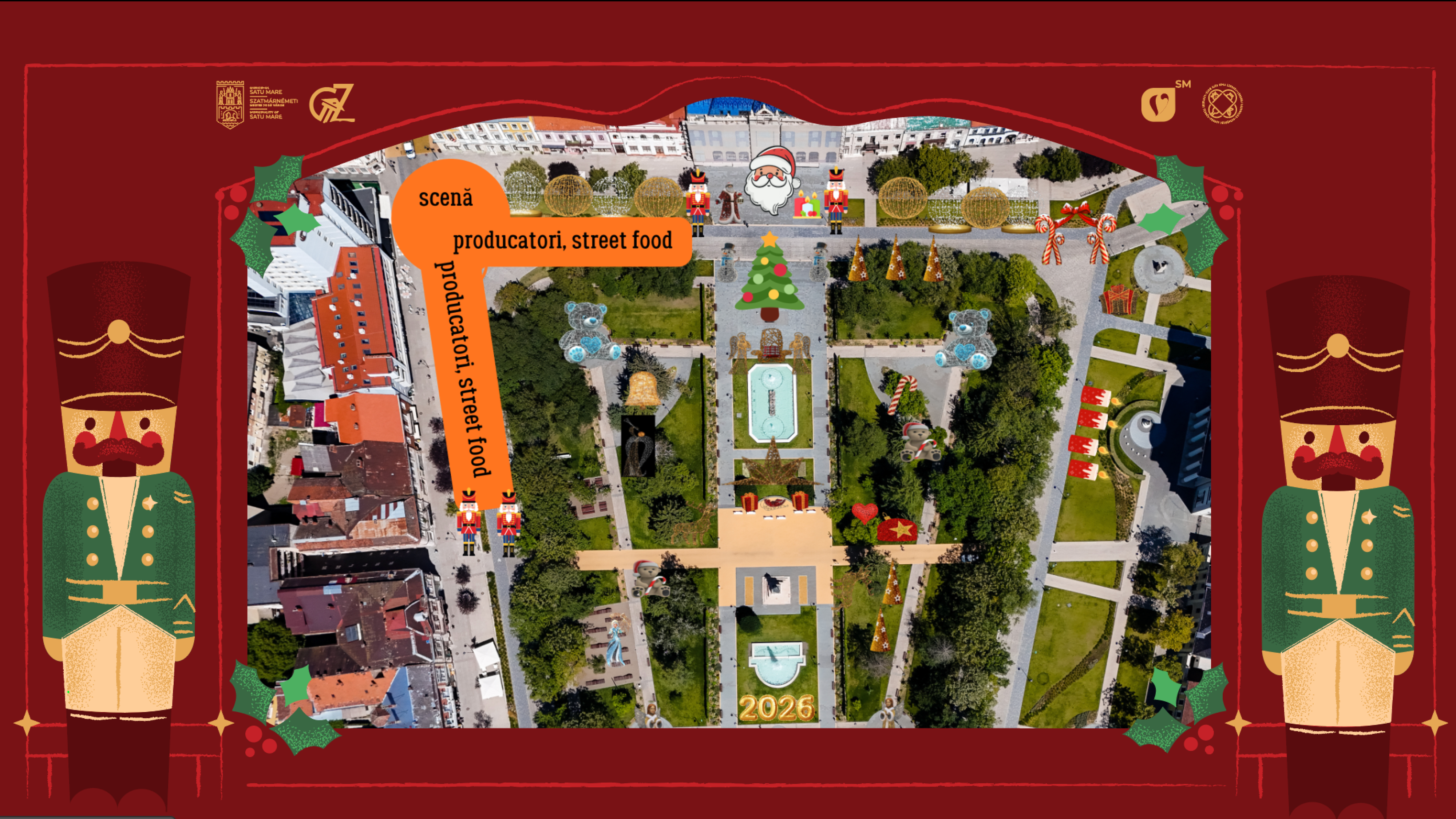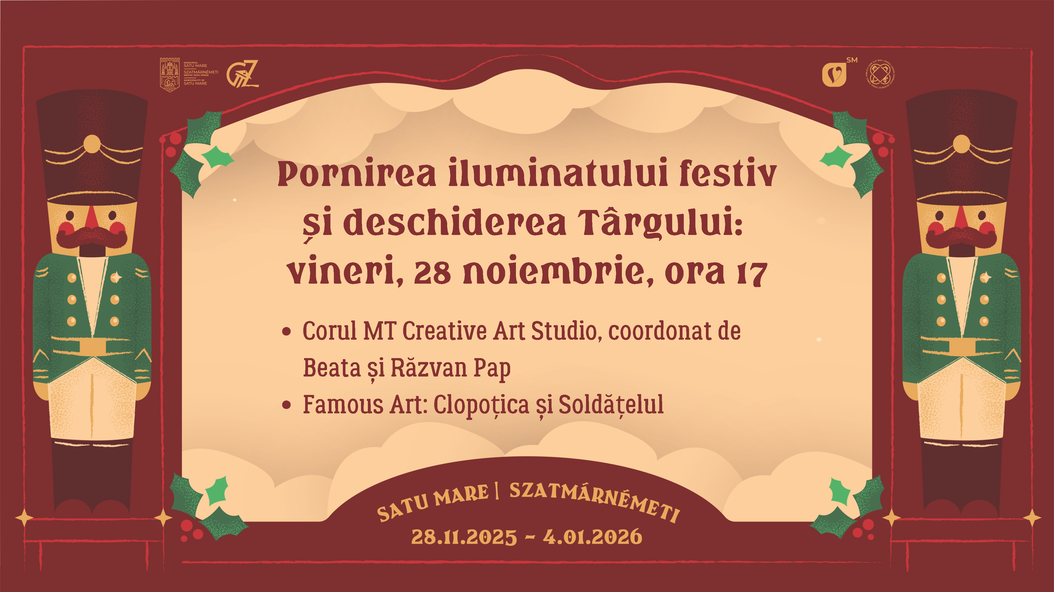 Târgul de Crăciun din Satu Mare reunește magia, farmecul și tradițiile sărbătorilor într-un decor de poveste. În strălucitoarele lumini, lângă bradul împodobit, vizitatorii vor descoperi atmosfera autentică a Crăciunului. Seara inaugurală va fi deschisă de Corul MT Creative Art Studio, coordonat de Beata Pap și Răzvan Pap, cu un concert de colinde și cântece de iarnă. Sătmărenii prezenți la deschiderea Târgului vor avea parte de o surpriză cât se poate de plăcută, în mijlocul mulțimii făcându-și apariția pentru un spectacol vizual de dans, teatru și interacțiune Clopoțica și Soldățelul, care cu siguranță vor aduce bucurie, ritm și energie la întâlnirea cu sătmărenii. Pe picioroange înalte, Spărgătorul de Nuci, întruchiparea magiei clasice a sărbătorilor de iarnă și Clopoțelul, purtător al glasurilor de colind, dansează un vals spectaculos la care vă invităm cu drag să luați parte. Spectacolul este realizat de Famous Art din Cluj-Napoca.