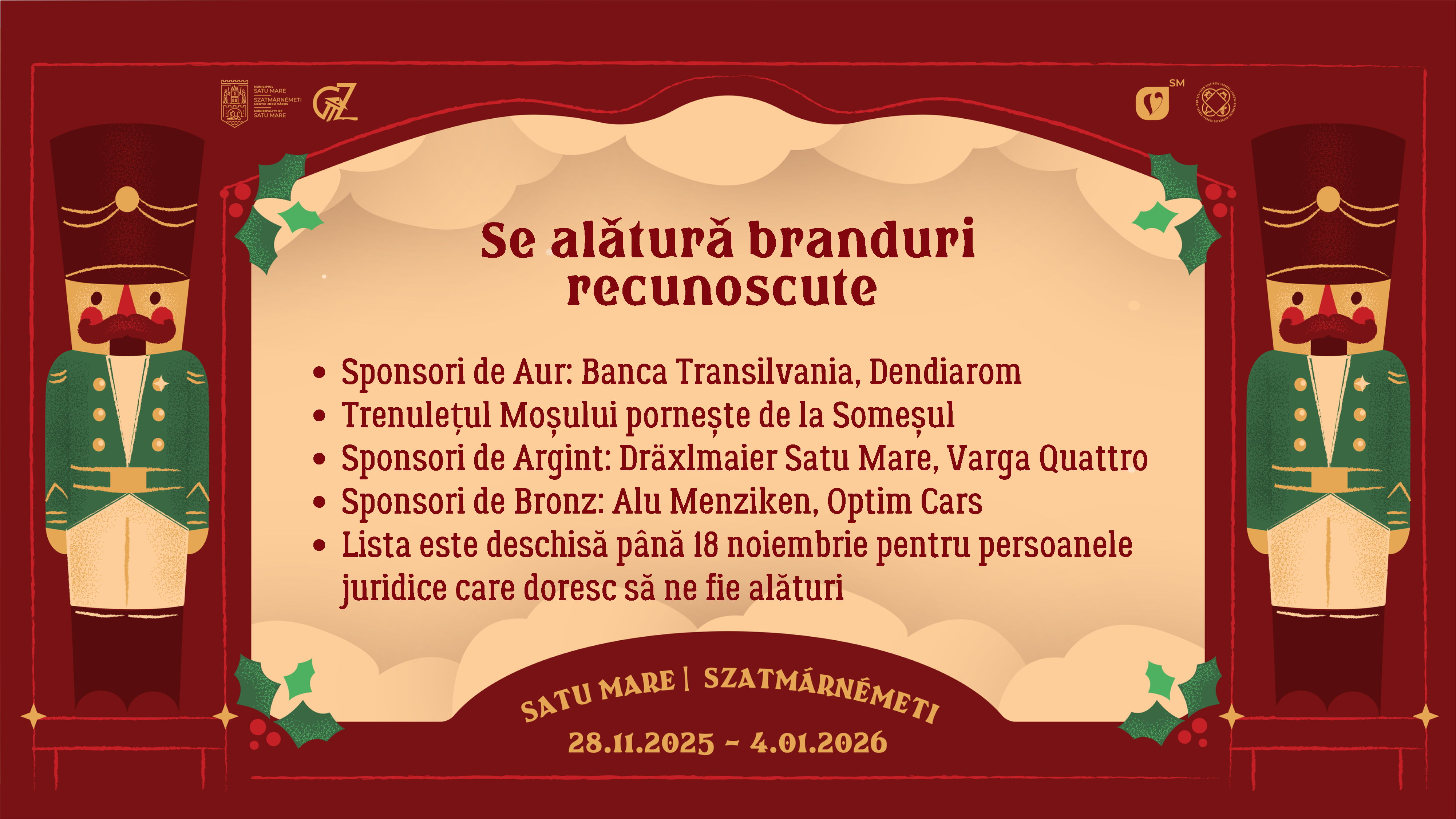 La ediția din acest an ne sunt alături: Sponsor de Aur: Banca Transilvania, Dendiarom; Trenulețul Moșului pornește de la Someșul; Sponsor de Argint: Dräxlmaier Satu Mare, Varga Quattro; Sponsor de Bronz: Alu Menziken, Optim Cars.