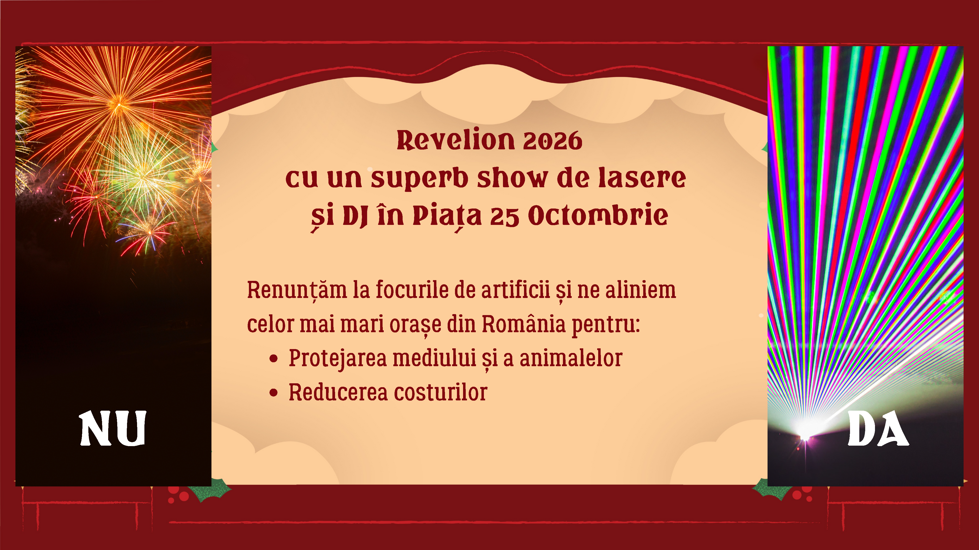 Trecerea dintre ani o vom petrece tot împreună, în Piața 25 Octombrie. Revelionul în aer liber va aduce o mare petrecere cu DJ, iar anul acesta focurile de artificii le înlocuim cu un show de lasere. Ne aliniem celor mai mari orașe din România, renunțând la focurile de artificii și pregătind un super SPECTACOL DE LASERE.