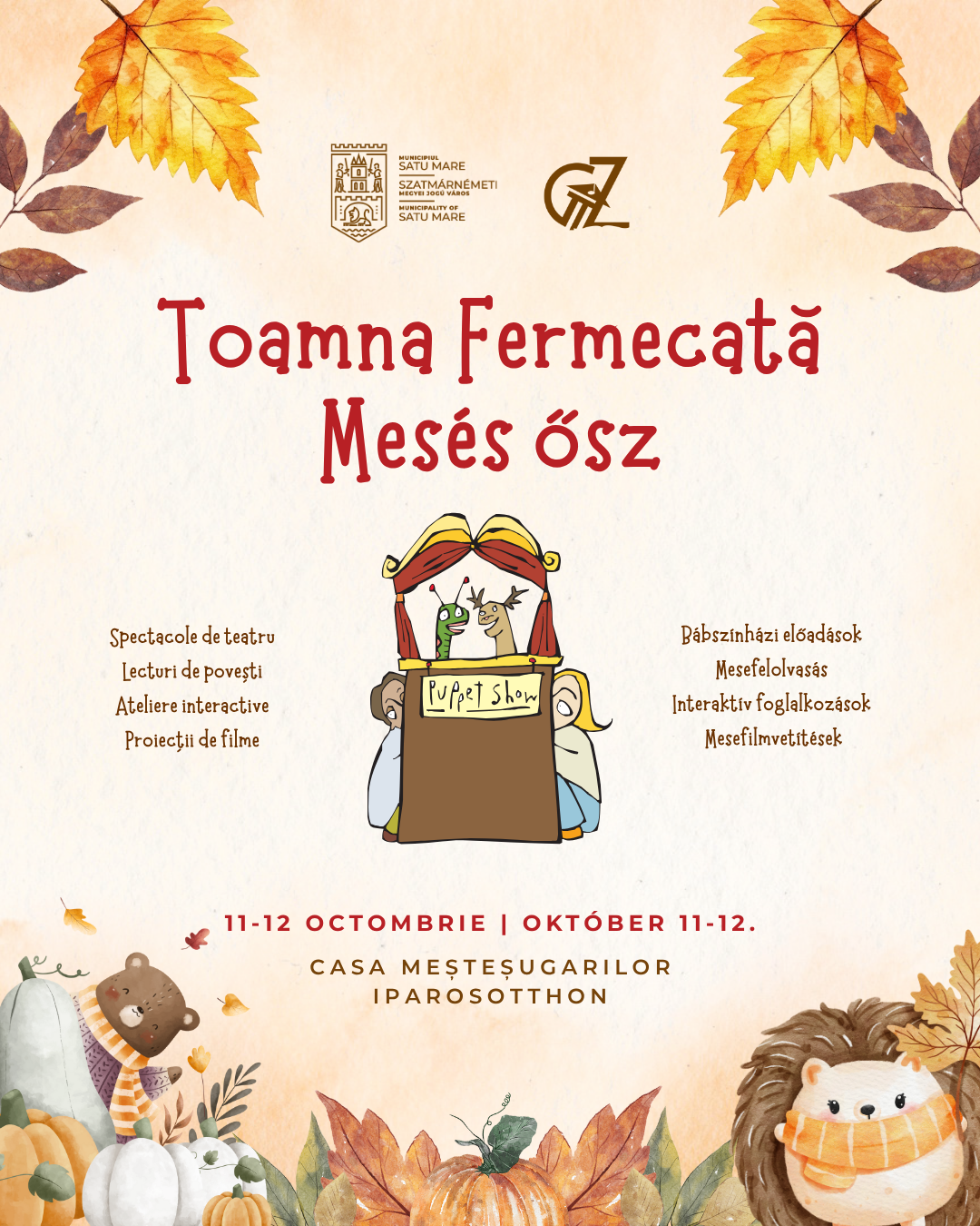 Evenimentul „Toamna fermecată”, organizat de Primăria Municipiului Satu Mare și Centrul Cultural G. M. Zamfirescu, își propune să aducă în atenția copiilor de toate vârstele spectacole de teatru de păpuși, în limba română și limba maghiară, lecturi de povești, ateliere interactive și proiecții de filme. Copiii vor avea parte de o fascinantă călătorie în lumea basmelor, prin joc și imaginație descoperind tărâmuri fermecătoare.